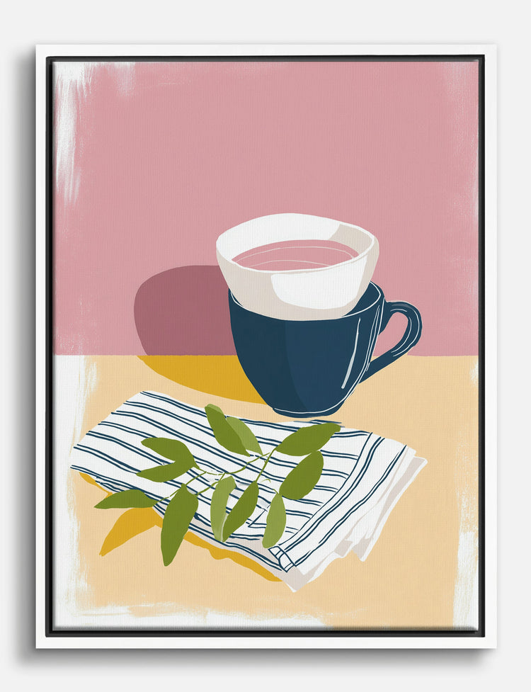 Start your day with a touch of calm sophistication. This charming print captures the simple pleasure of a quiet moment—a deep blue mug, a striped napkin, and a sprig of greenery, all set against soft blush and buttery hues.