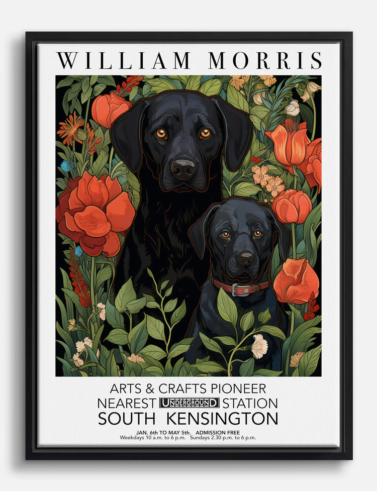 Two soulful black labs peek out from a lush tapestry of poppies and leaves, instantly warming up your space with their gentle presence. This piece channels both classic charm and pure affection—perfect for anyone who wants their home to feel inviting and full of life.