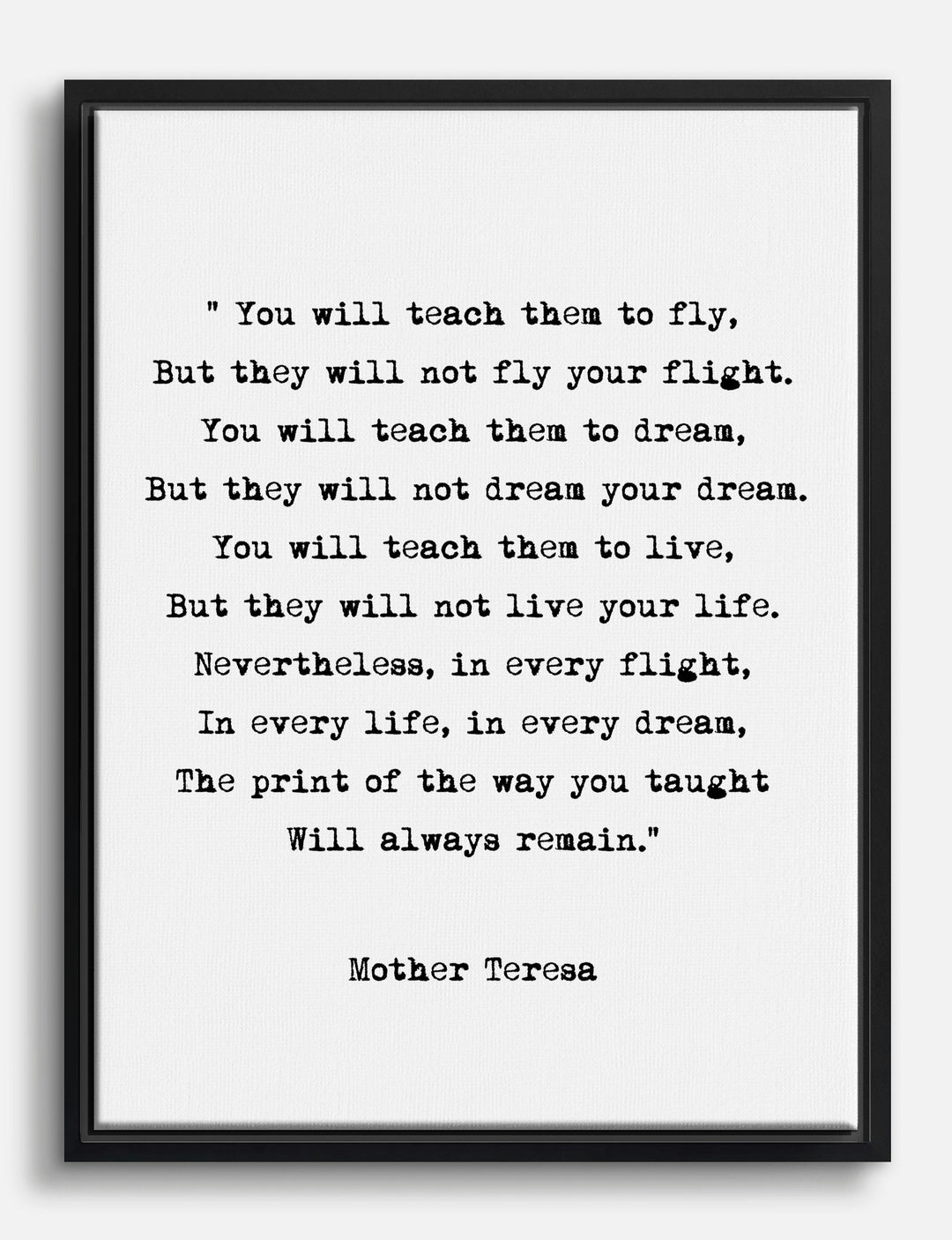 Let your walls whisper encouragement with this timeless Mother Teresa quote, elegantly typed for a touch of vintage charm. The classic black-and-white palette makes it a stylish fit for any room, while the message inspires a sense of purpose and warmth every time you see it. Perfect for your office, bedroom, or anywhere you want a daily reminder of the lasting impact you have on others, this piece turns your space into a haven of hope and inspiration.