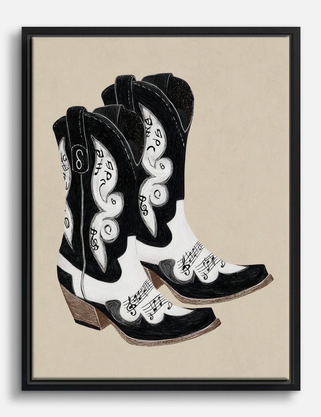 Ready to kick up your heels? These black-and-white cowboy boots, adorned with playful musical notes, strike just the right chord between bold style and a love for all things country. Every detail pops with personality, making this piece a joyful tribute to music and western flair.