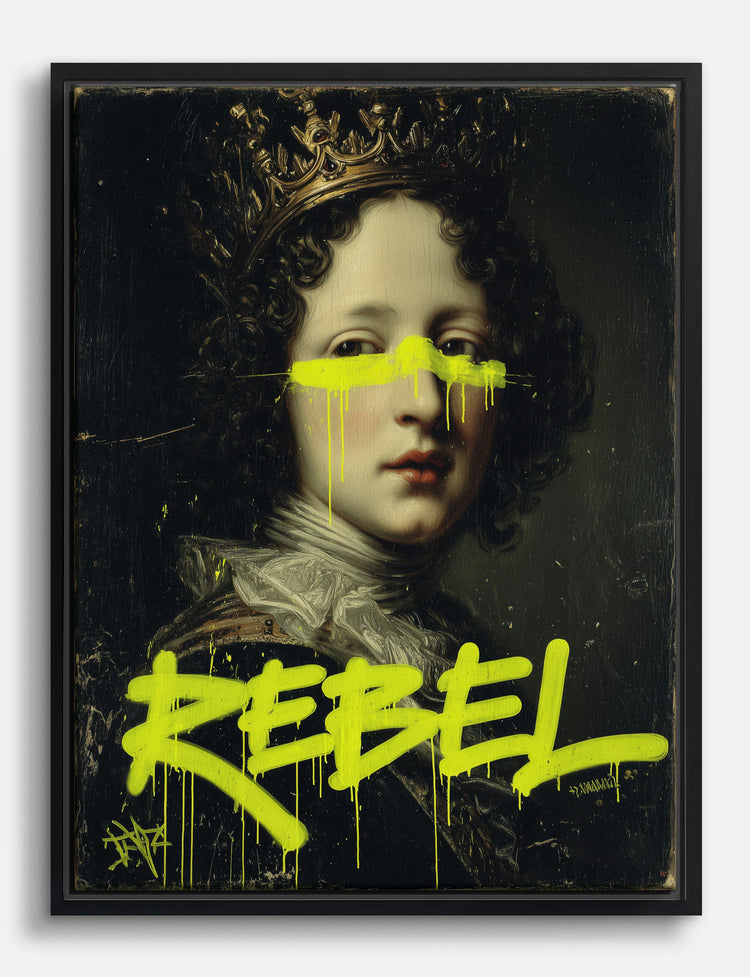 This piece is pure attitude — a regal portrait meets street-smart edge, all in one unforgettable statement. The bold neon yellow graffiti slice and scrawled “REBEL” bring instant energy, making any wall feel like your own personal gallery.