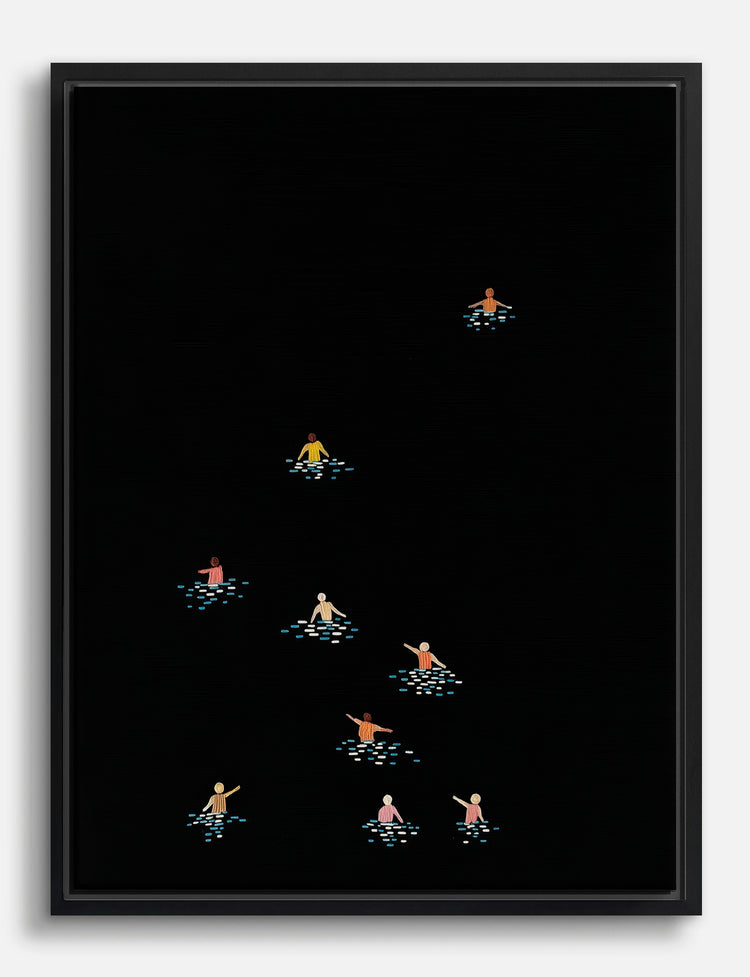 Tiny bursts of color float in a sea of midnight—each swimmer a story, each ripple a spark of life. There’s something quietly magical about this piece, as if you’re catching a secret moment under the stars. It brings a sense of wonder and calm, perfect for when you want your walls to feel both bold and serene.