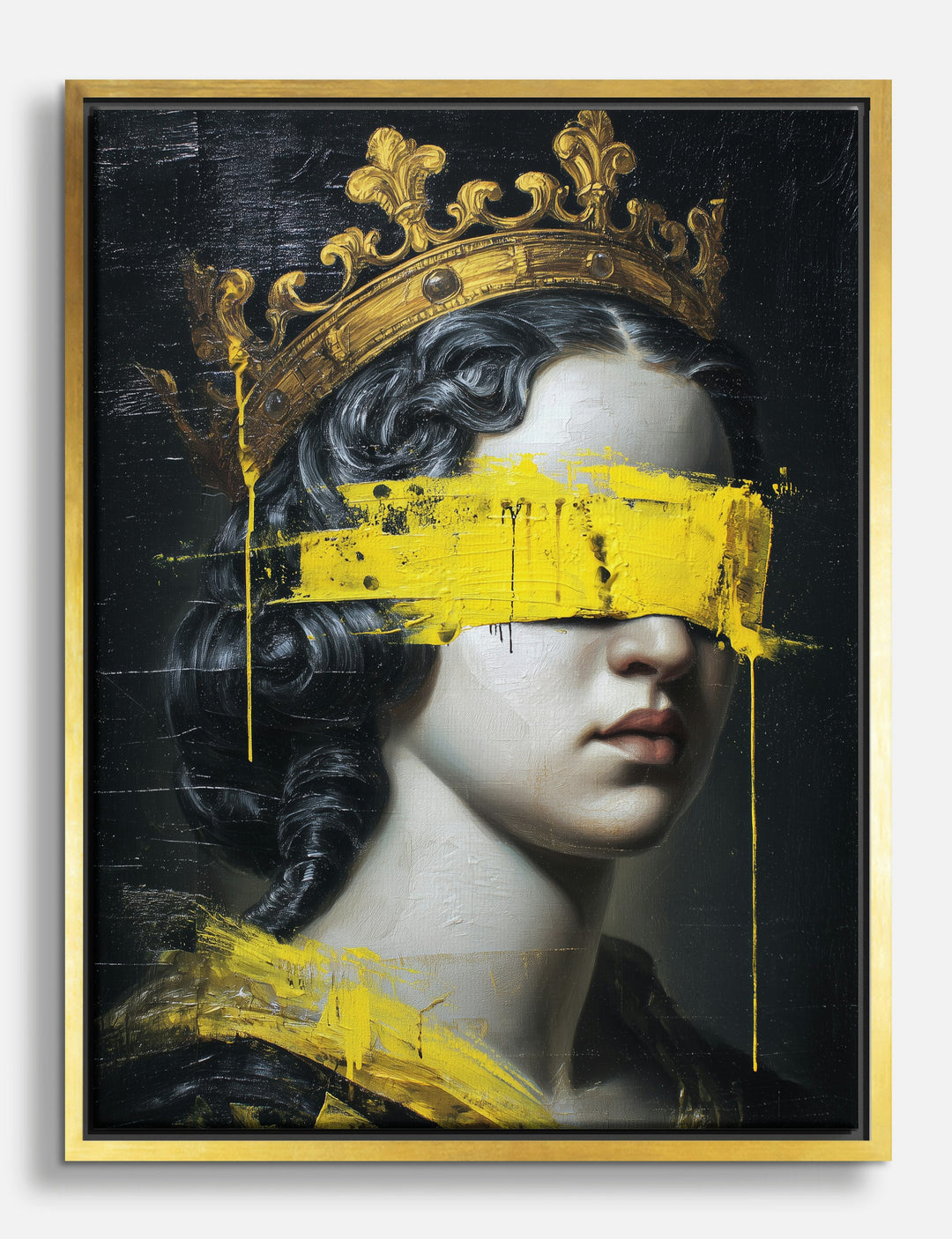 Bold, mysterious, and unapologetically regal—this piece commands attention from the moment you enter the room. The striking contrast of golden crown and vivid yellow brushstroke brings a sense of modern rebellion to classic portraiture, adding instant intrigue to your space.