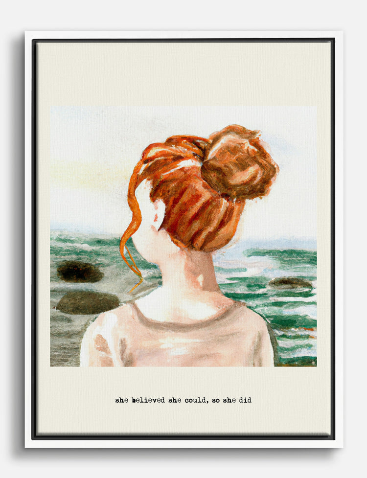 A single moment of courage, captured in soft watercolor. This uplifting piece features a woman gazing out to sea, her hair swept up in a carefree bun, radiating quiet strength. The gentle earth and ocean tones bring a sense of calm, making it perfect for your bedroom or a cozy reading nook.
