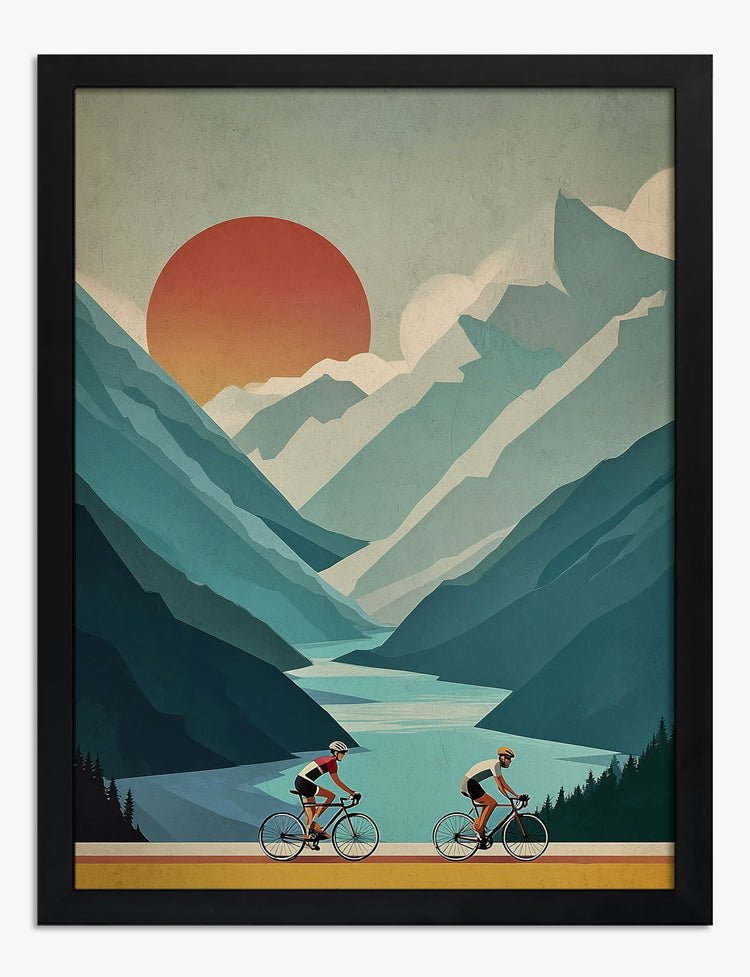 Bold color and crisp lines bring the thrill of adventure right into your home. Two cyclists speed along a winding road, framed by towering mountains and a glowing sun—reminding you that the best journeys start with a single push. This print energizes any space with a sense of movement and possibility. Its perfect for your living room or home office, where you want motivation and style to meet. The cool blues and warm sunset tones pair easily with modern, boho, or minimalist decor—making it a breeze to refresh your walls. Let this piece inspire your next adventure every time you walk by. Your space, your story—make it unforgettable.