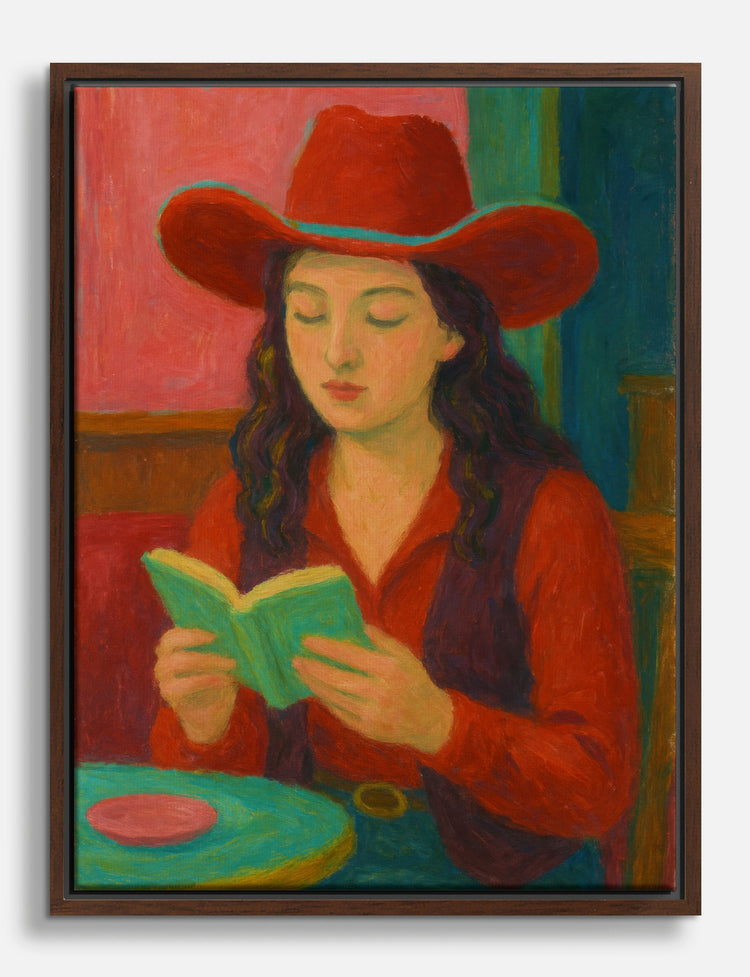 Dive into a serene moment with Western Bookworm, where a young woman in a vibrant red hat finds solace in the pages of a book. This piece adds a touch of rustic charm to your living space, perfect for a cozy reading nook or a vibrant entryway. The warm hues of red and brown beautifully complement various decor styles, inviting a sense of comfort and style into your home. Let this unique artwork inspire your space with its blend of simplicity and depth.