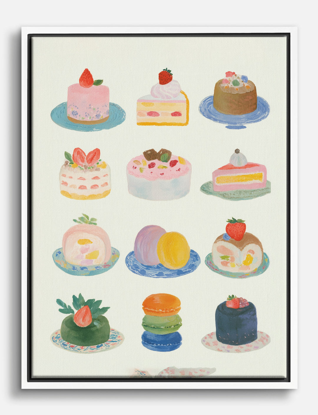 Sweeten up your space with a playful parade of watercolor treats. Rows of delicate cakes, macarons, and pastries invite a sense of joy and warmth, perfect for brightening any kitchen or dining nook. Each dessert is hand-painted with soft pastels and charming detail, making this piece a celebration of everyday indulgence.