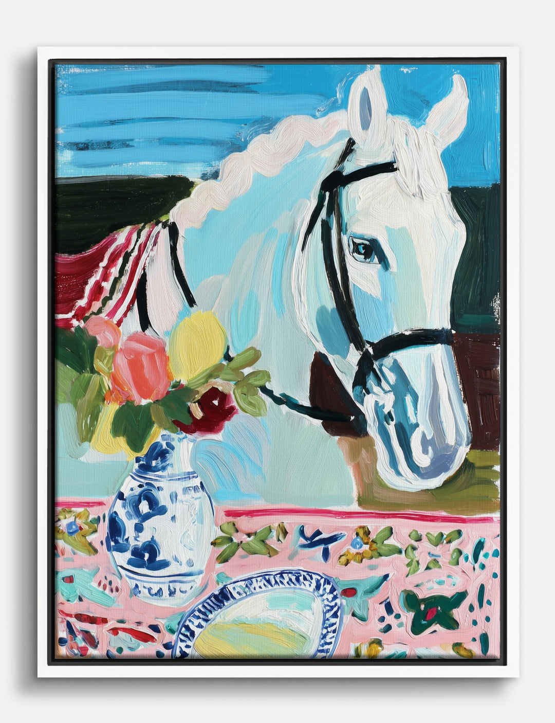 A white horse, bold and serene, meets a burst of playful florals and patterned ceramics in this lively piece. The mix of cool blues, soft pinks, and energetic brushstrokes instantly brightens your space—think effortless style with a touch of whimsy.