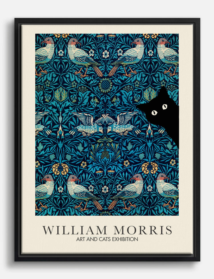 A peek of playful curiosity meets timeless beauty—this piece brings a dash of delight to any room. The lush, intricate blue botanicals, inspired by William Morris, create a rich tapestry that feels both classic and fresh. Meanwhile, a wide-eyed black cat pops in, adding a spark of whimsy and personality.