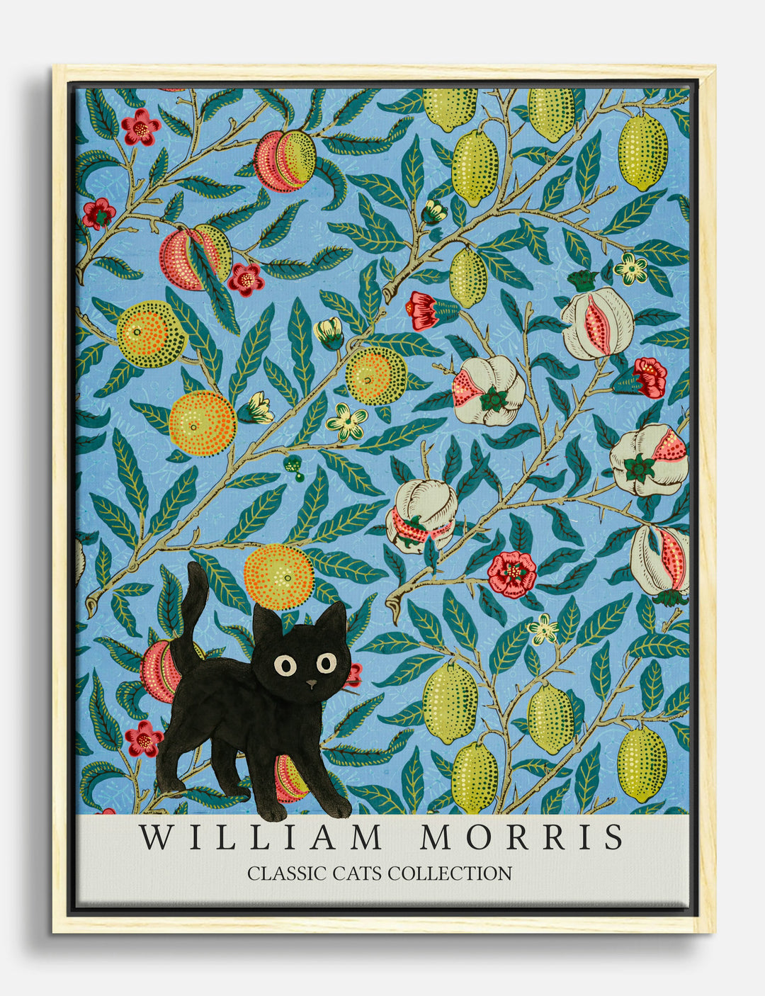 A playful black cat pops against a lush tapestry of golden fruit and leafy vines, all set on a dreamy sky-blue background. This piece instantly brings a sense of whimsy and vintage charm to your space, inviting curiosity and smiles.