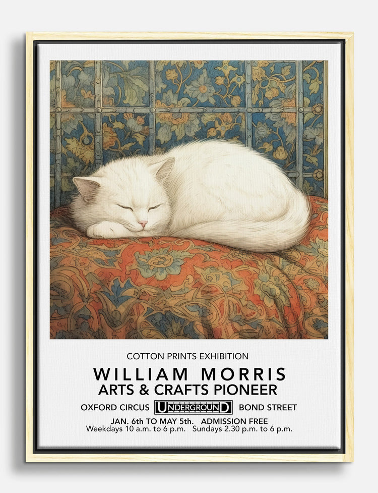 Soft elegance meets timeless comfort in this charming William Morris piece. A snowy white cat, curled up and dreaming, brings a sense of calm and warmth to any space. Let this gentle scene turn your bedroom or reading nook into a cozy retreat, where relaxation always takes center stage.