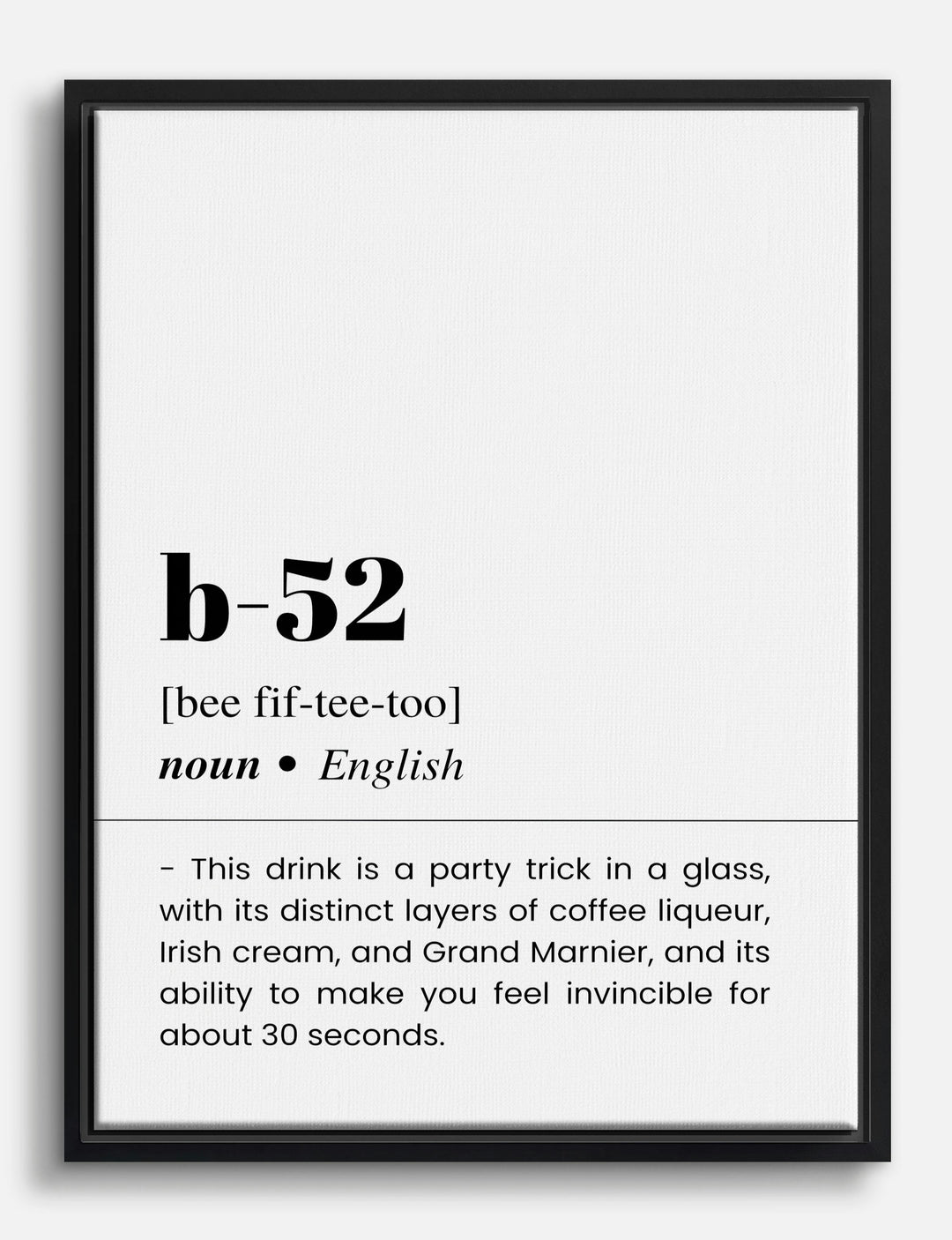 Ready to bring a little bar magic into your home? This playful, minimalist piece celebrates the B-52—an icon of layered cocktails and good times. With its crisp typography and witty definition, it instantly adds personality and a dash of humor to your kitchen, dining nook, or home bar.