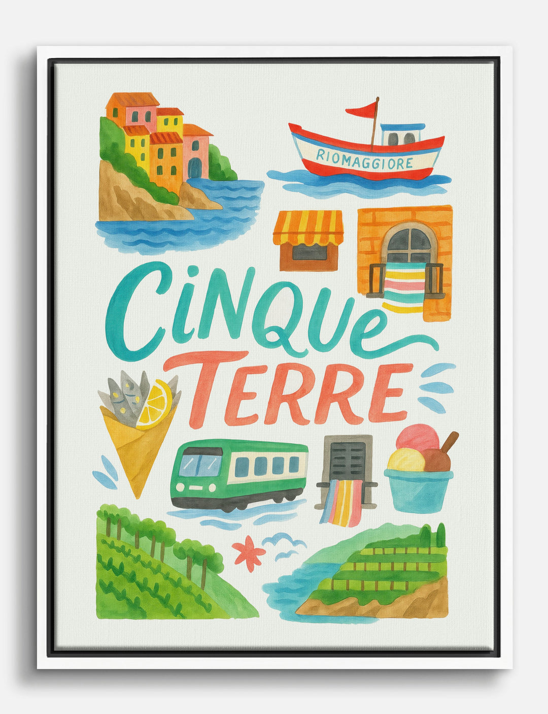 Dive into the vibrant spirit of Italys Cinque Terre with this delightful watercolor piece. Perfect for adding a splash of color to your kitchen or dining room, it captures the essence of coastal life with its playful depictions of iconic landmarks, boats, and local treats. The harmonious blend of warm and cool tones complements any decor, inviting a sense of wanderlust and joy into your space.