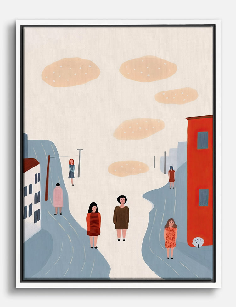 A gentle cityscape, dotted with tiny figures, captures that quiet magic of everyday moments. You’ll feel a sense of calm and connection every time you pass by—like a snapshot of urban life softened by dreamy, peach-tinted clouds.