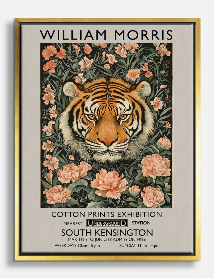 Feel the wild grace of nature with this striking piece by William Morris. A powerful tiger head emerges amidst lush florals, bringing both strength and serenity to your space. Perfect for your living room or bedroom, this art complements a variety of decor styles with its rich, earthy tones. Let this piece inspire pride and elegance in your home, reminding you of the beauty and power that lies within.