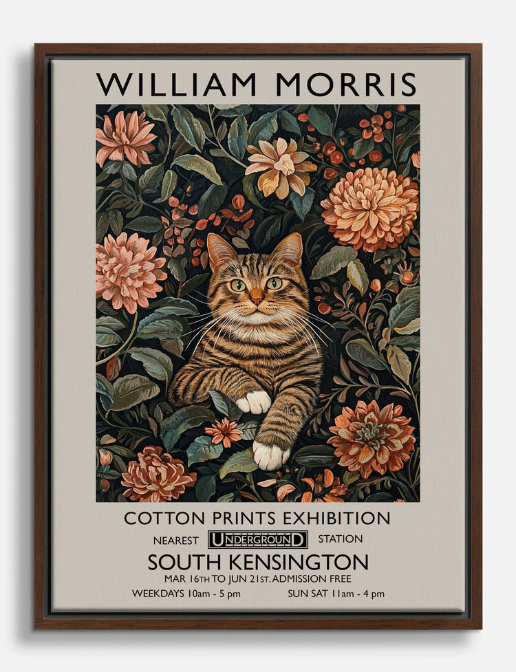 Embrace the charm of vintage elegance with this captivating William Morris-inspired piece. A tabby cat nestled among lush florals invites warmth and whimsy into your home. Perfect for your living room or bedroom, the rich earth tones harmonize beautifully with both traditional and modern decor. Let this enchanting artwork transform your space into a cozy haven of style and personality.
