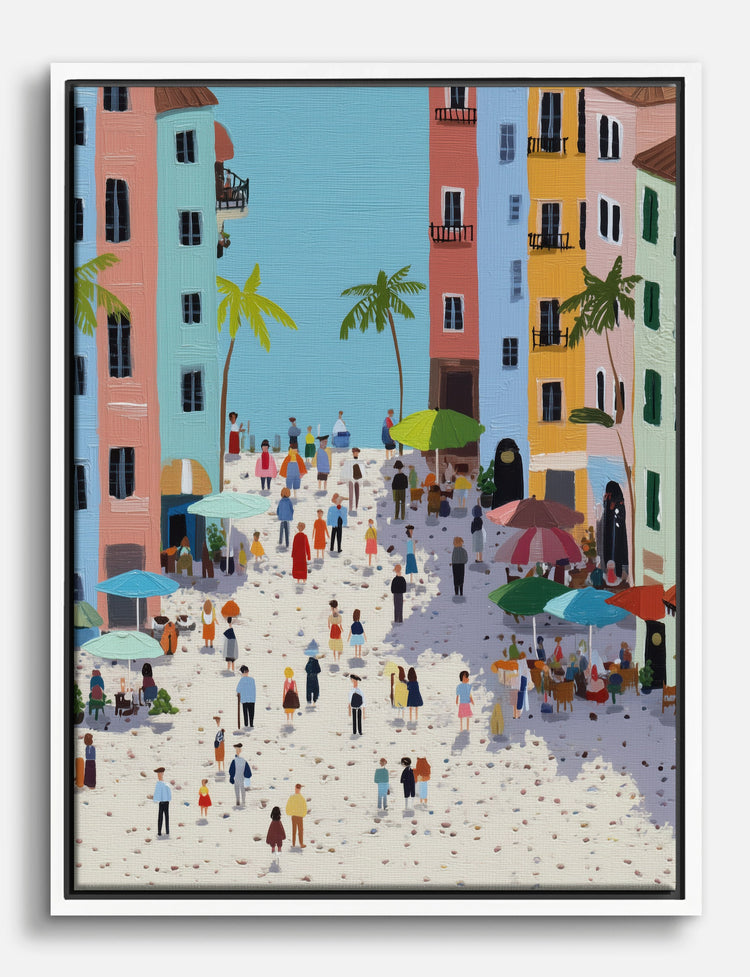 Step into the sun-drenched charm of a bustling Mediterranean square, where pastel buildings and swaying palms set the scene for everyday magic. This piece instantly brings a sense of wanderlust and warmth, perfect for sparking joy in your living room or brightening up an entryway. The playful mix of soft blues, pinks, and yellows pops against any décor, making your home feel like a stylish getaway. Let your walls celebrate life’s simple pleasures—because great style should be effortless and joyful.