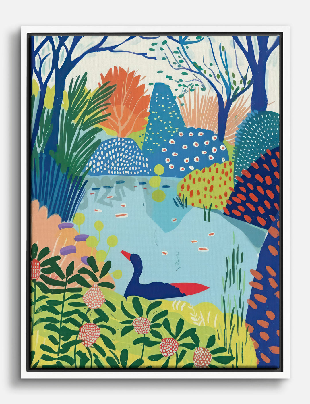 Vivid blues and playful pops of green invite a sense of calm adventure into your home. This cheerful piece transforms any wall into a lush, whimsical oasis—perfect for when you crave a little escape without leaving your living room. The painterly patterns and gentle duck gliding across the water bring effortless charm and a touch of personality to your space.