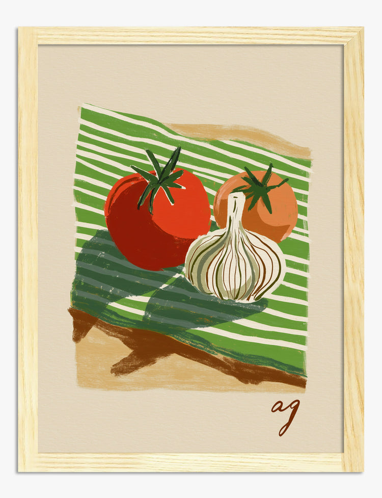 Bold shapes and earthy colors bring a rustic charm to your space with this delightful still life. Two ripe tomatoes and a bulb of garlic rest on a fresh green-striped cloth, instantly evoking the warmth of a sunlit kitchen. This piece is a celebration of everyday beauty—perfect for anyone who loves to cook, gather, or simply savor life’s simple pleasures. The rich reds and greens pop against a neutral background, making it an easy fit for modern, minimalist, or farmhouse decor. Hang it in your kitchen or dining area to spark inspiration for your next meal, or let it add a cozy, welcoming vibe to your entryway. With this print, you’ll turn any wall into a personal statement of style, comfort, and creativity—no renovations required.