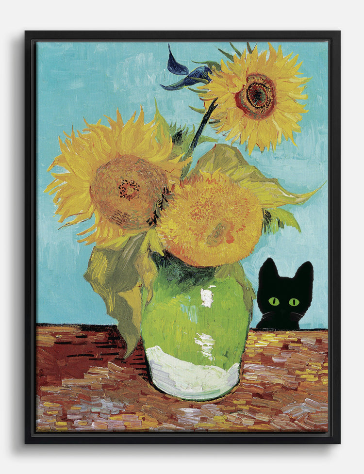 A burst of golden sunflowers meets a playful pop of personality—this piece instantly brightens any space with its bold color and unexpected twist. The curious black cat peeking from behind the vase adds a spark of whimsy, making every glance feel like a little surprise.