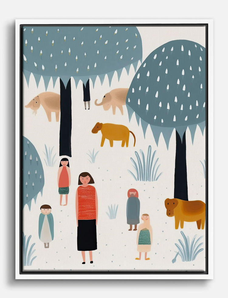 Step into a playful world where curiosity and imagination run wild. This charming illustration brings together gentle animals and tiny explorers beneath whimsical, storybook trees—perfect for sparking wonder in any room. The soft, muted palette of blues, browns, and warm neutrals creates a calming vibe that complements both modern and eclectic decor.