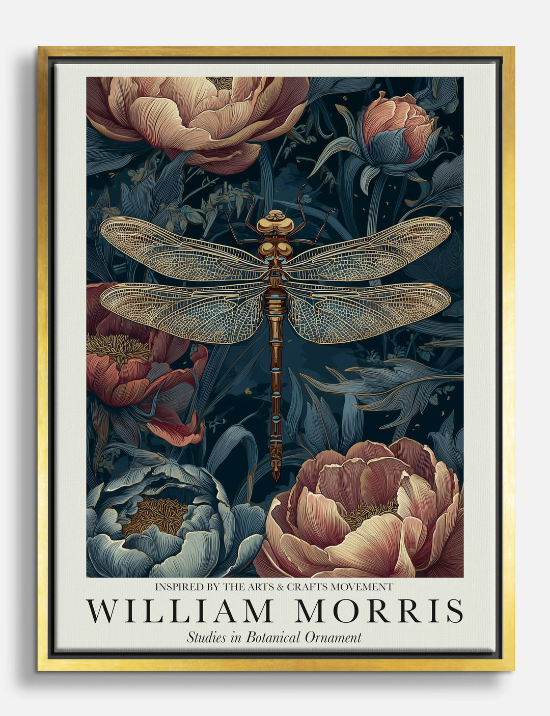 A single dragonfly poised among lush, blooming peonies—this piece brings a sense of calm wonder to your walls. Inspired by the timeless artistry of William Morris, it’s the perfect way to add a dash of vintage elegance while making your space feel truly unique.