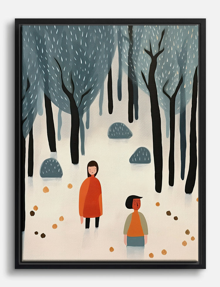 A hush falls over your space with this enchanting forest scene — two tiny figures exploring a snowy woodland, wrapped in warmth and wonder. The moody blues and soft creams instantly create a calm, inviting vibe, perfect for curling up with a good book or sharing stories with friends.