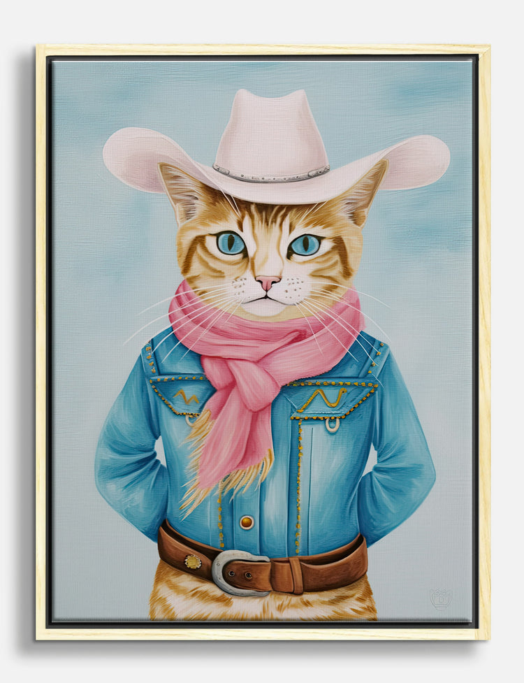 A tabby in a denim jacket and pink scarf? Now that’s personality. This confident cowboy cat brings a burst of playful charm and a hint of Western flair to your space—guaranteed to spark smiles and conversations.