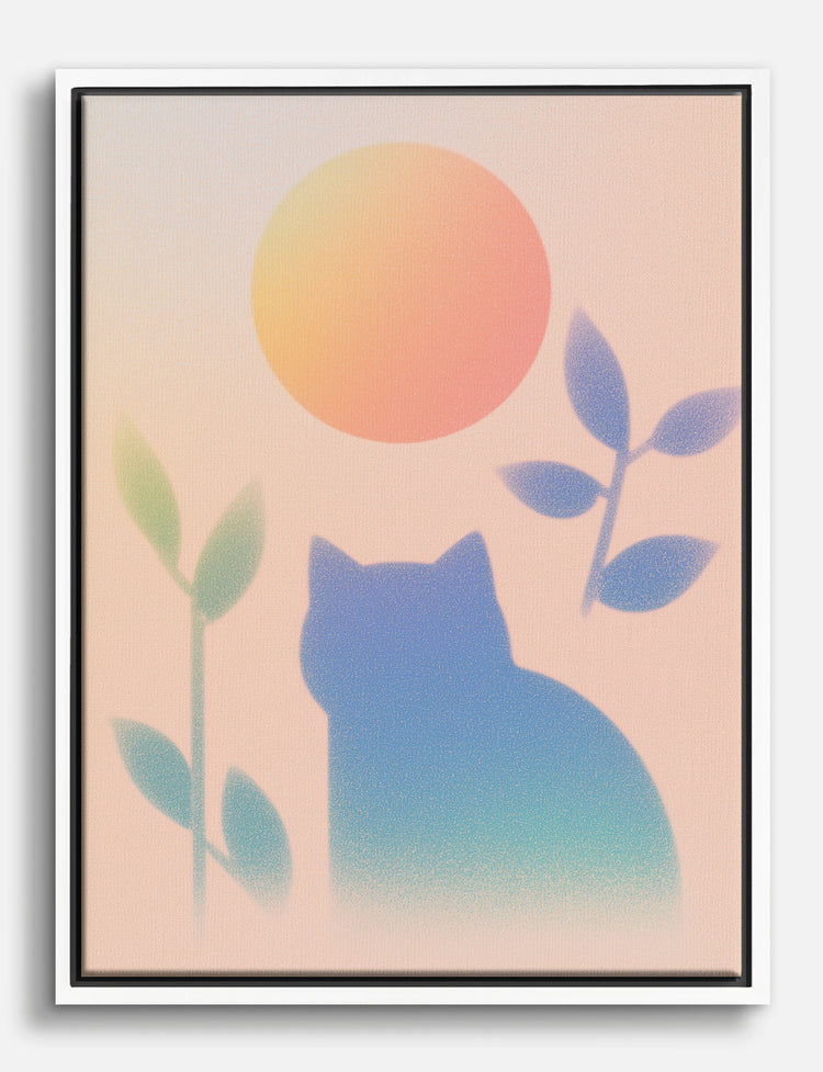 There’s something magical about the quiet companionship of a cat soaking in the sunrise. This soft, pastel-hued piece brings that gentle moment right into your space, wrapping your walls in calm and comfort. The dreamy gradient blends of peach, blue, and green make it a perfect match for both modern and cozy settings, adding a touch of soothing style wherever it hangs.