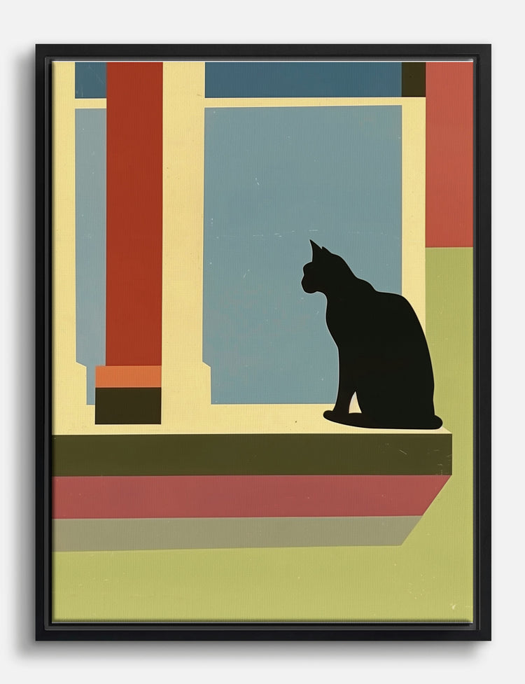 Discover the quiet elegance of a cat perched against a window, where bold shapes and soothing colors meet. This piece brings a touch of minimalistic charm, perfect for your living room or bedroom. Let its calming presence and versatile hues seamlessly blend with your decor, making your space feel uniquely yours.