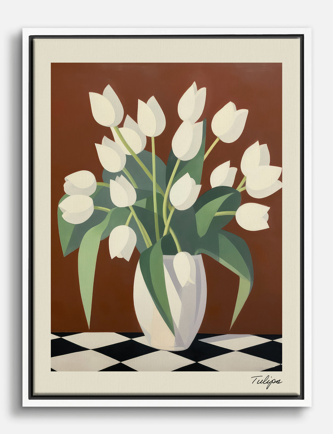 Bold, graphic tulips bring a sense of modern calm to any space. This striking arrangement of creamy white blooms against a rich brown backdrop instantly elevates your room, making even everyday moments feel a bit more special. Whether it’s brightening your dining nook or adding a chic finishing touch to your living room, you’ll love how the clean lines and soft tones blend effortlessly with any decor. This piece is proof that great style can be simple, fresh, and totally you.
