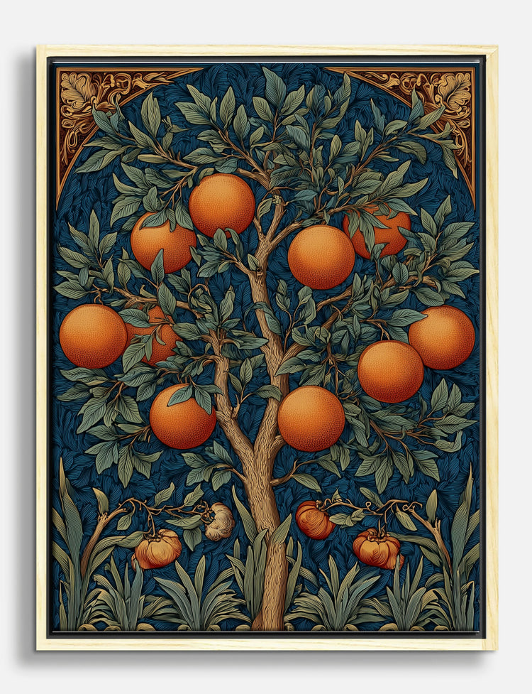 Vibrant oranges and lush greenery leap from a deep blue backdrop, transforming your walls into a scene that feels both classic and fresh. There’s a quiet confidence in this piece—like a secret garden that only you know about, ready to add a spark of style to your space.