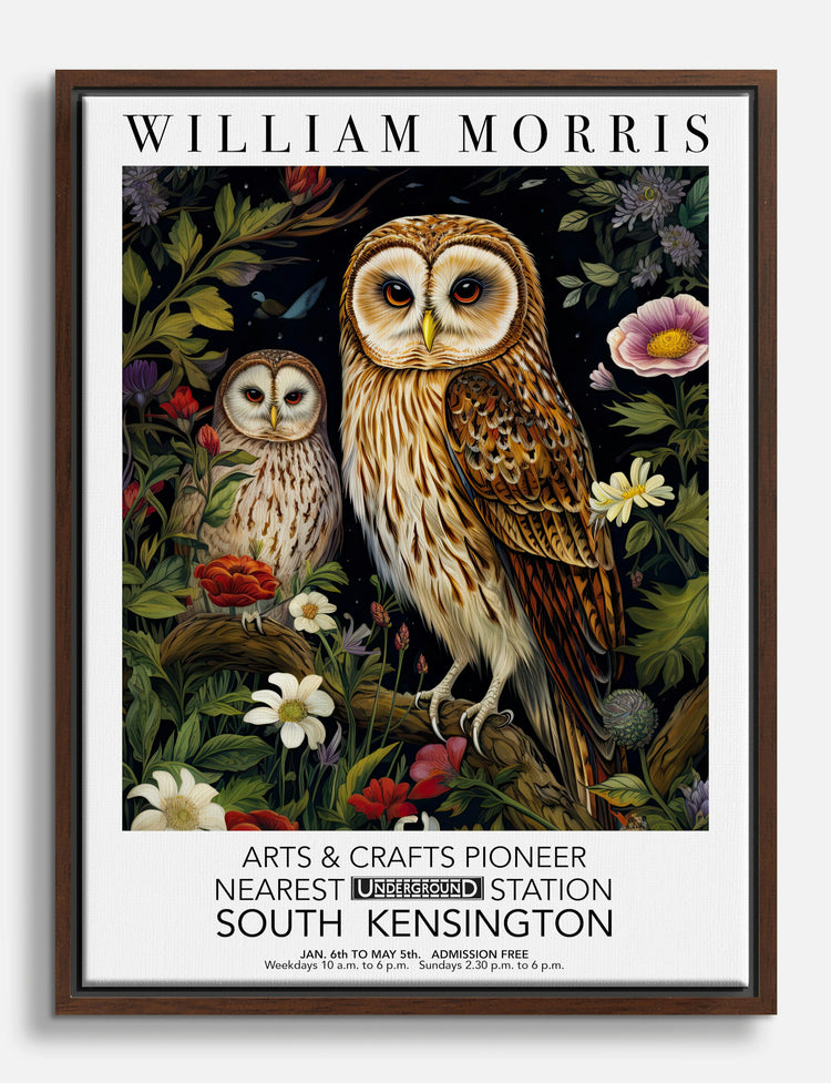 A pair of wise owls perched amid a lush tapestry of blooms — this William Morris-inspired piece brings a dash of woodland wonder right into your home. Earthy browns and vibrant greens pop against soft florals, creating a look that’s both classic and fresh.