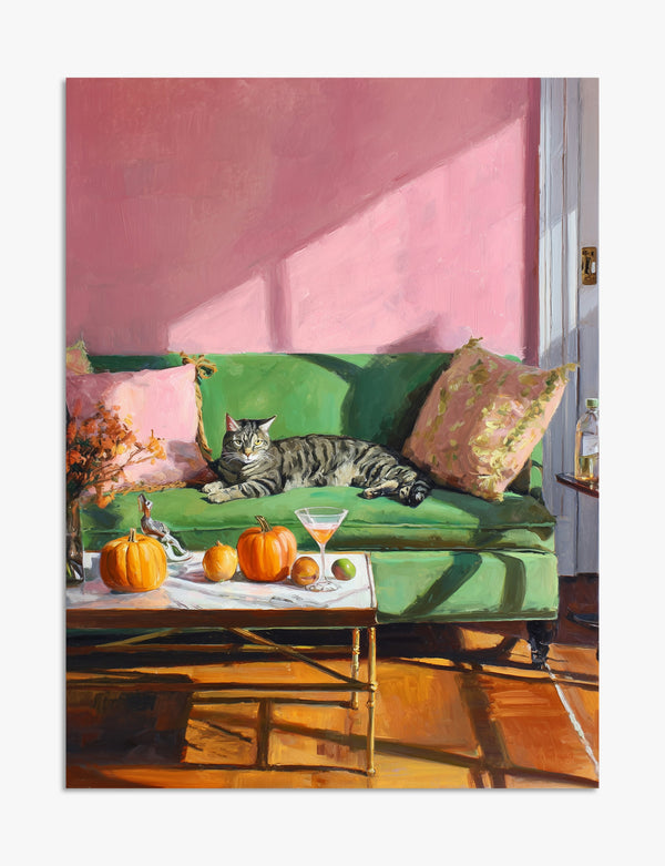 Poster gatto bianco su divano verde, atmosfera natalizia rétro