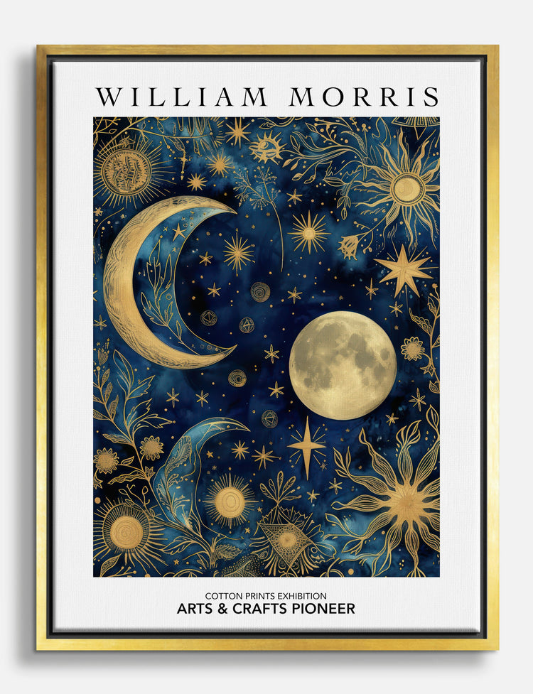 Dive into a cosmic tapestry with this enchanting celestial piece by William Morris. Rich navy and gold hues create a mesmerizing night sky filled with moons and stars, perfect for adding a touch of magic to your bedroom or living room. Let this artwork transform your space into a serene sanctuary, where style and wonder coexist effortlessly. Experience the joy of unique decor with Fab, and let your home shine with affordable elegance.