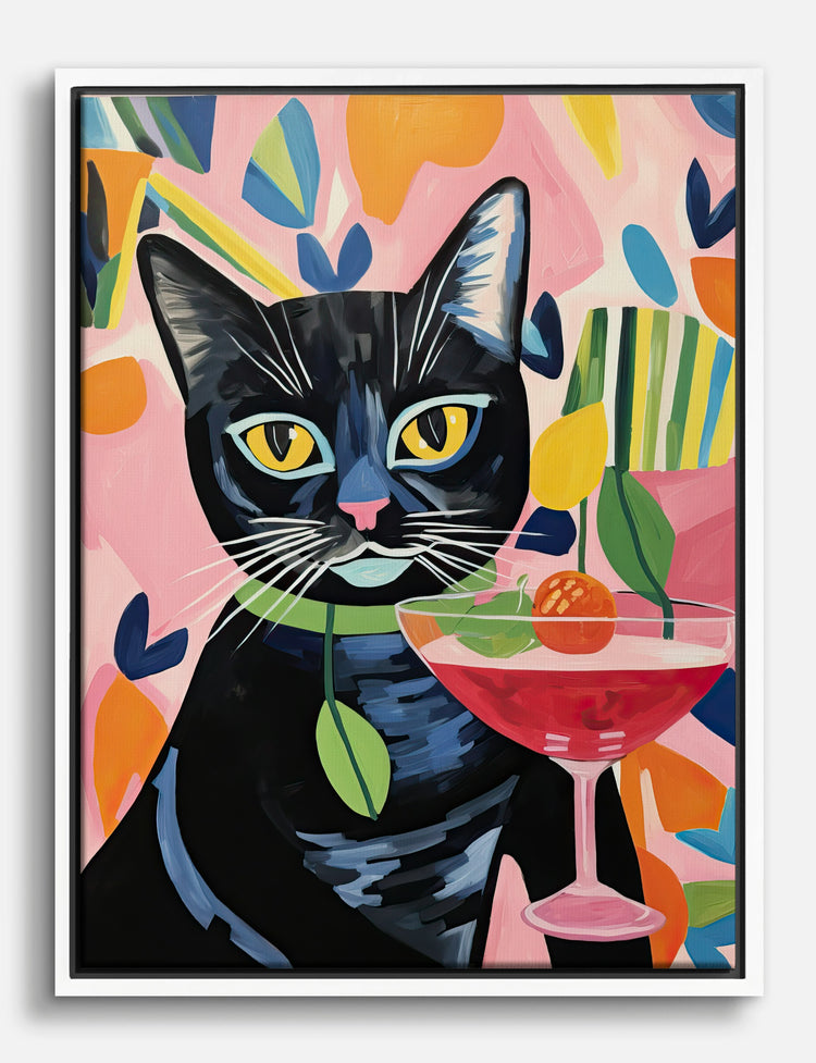 A burst of playful color and personality, this piece puts a charismatic cat front and center—cocktail in paw and ready to charm your space. You’ll love the way bold blues, vibrant pinks, and lush greens instantly energize your walls, making every day feel a little more fun.