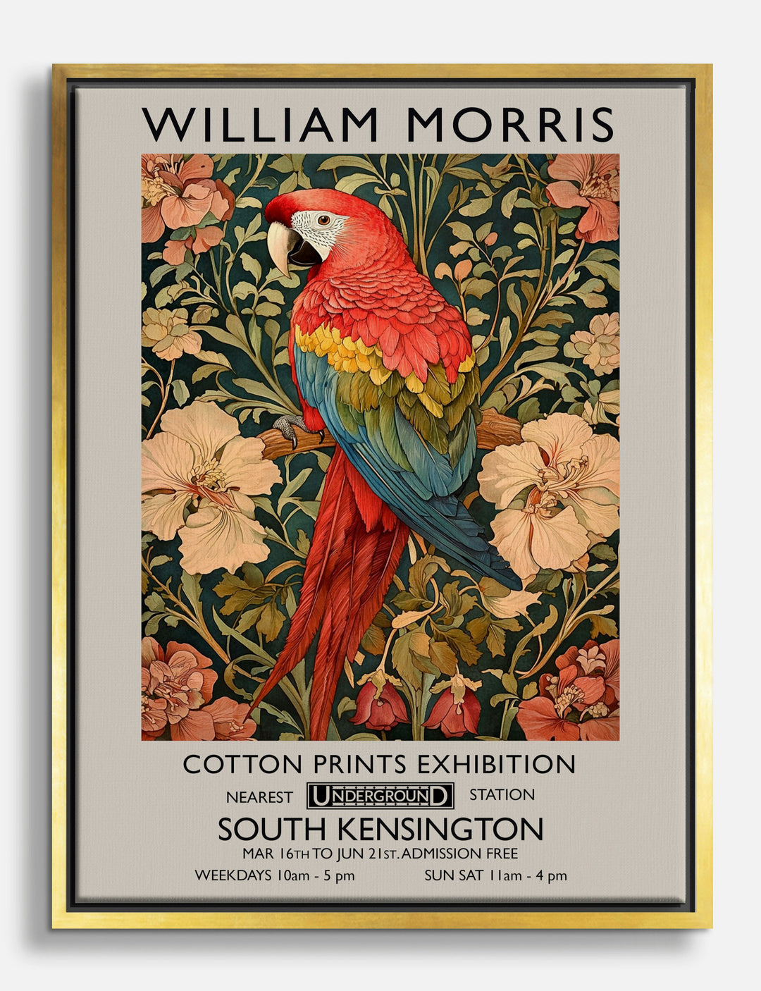 Transform your space with the timeless elegance of this William Morris-inspired piece. The vibrant parrot perched among intricate floral patterns brings a burst of color and life to your walls. Perfect for a living room or study, its rich hues harmonize beautifully with both classic and modern decor. Let this artwork be a conversation starter, adding a touch of sophistication and joy to your home.