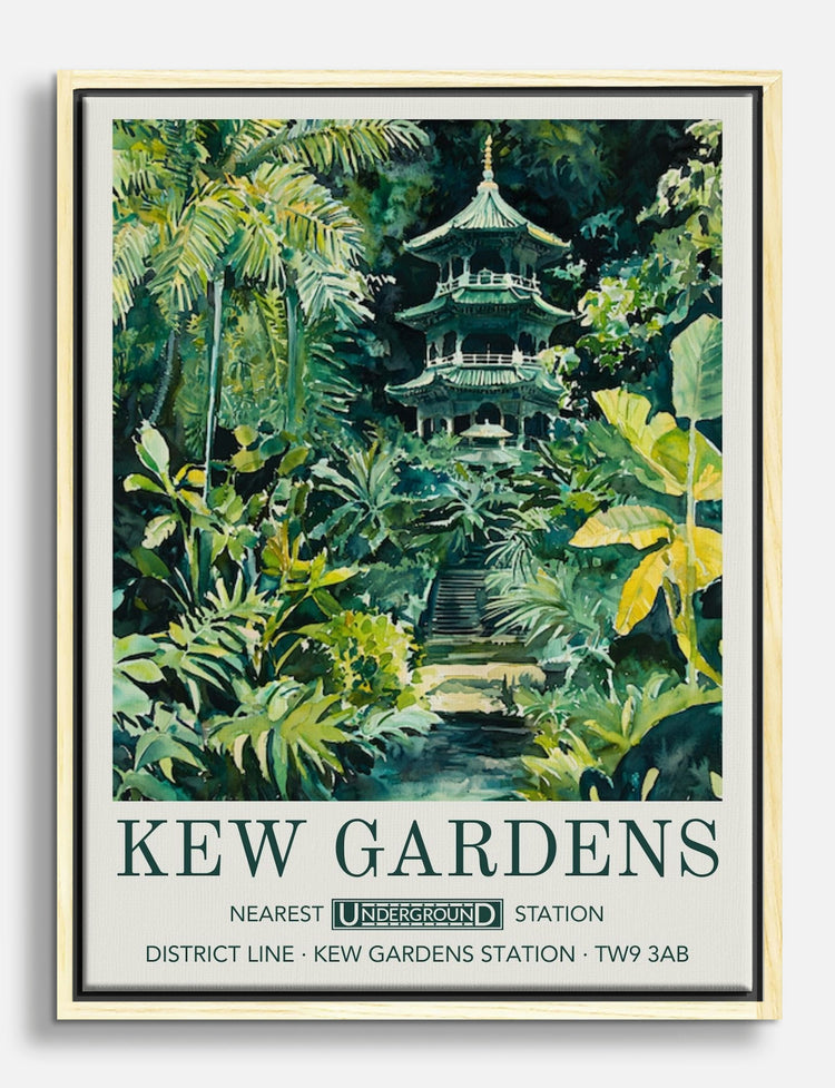 Step into a lush oasis with this enchanting artwork of Kew Gardens. The rich greens and intricate pagoda invite a sense of serenity and wonder, making it perfect for your living room or office. Let the vibrant foliage and calming architecture breathe life and tranquility into your space, effortlessly complementing a variety of decor styles.