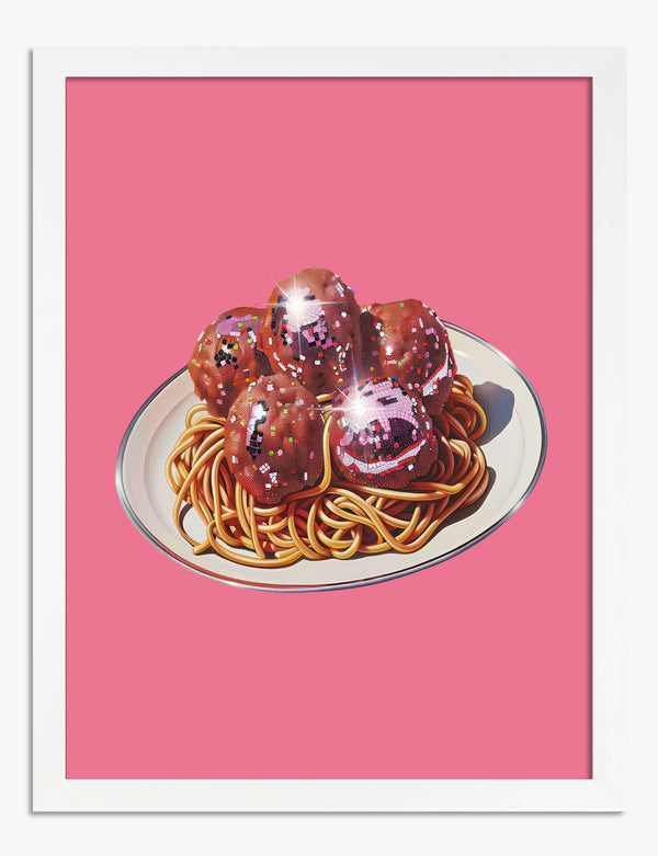 Poster disco spaghetti met gehaktballen, roze achtergrond