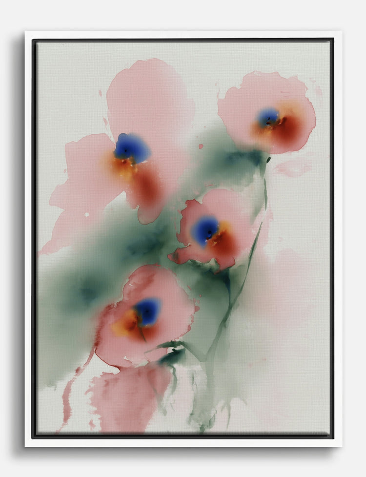 Soft washes of pink and hints of blue make this piece feel like a breath of fresh air for your walls. There’s a gentle, calming energy in the way these watercolor flowers seem to float, bringing a sense of lightness to any room.