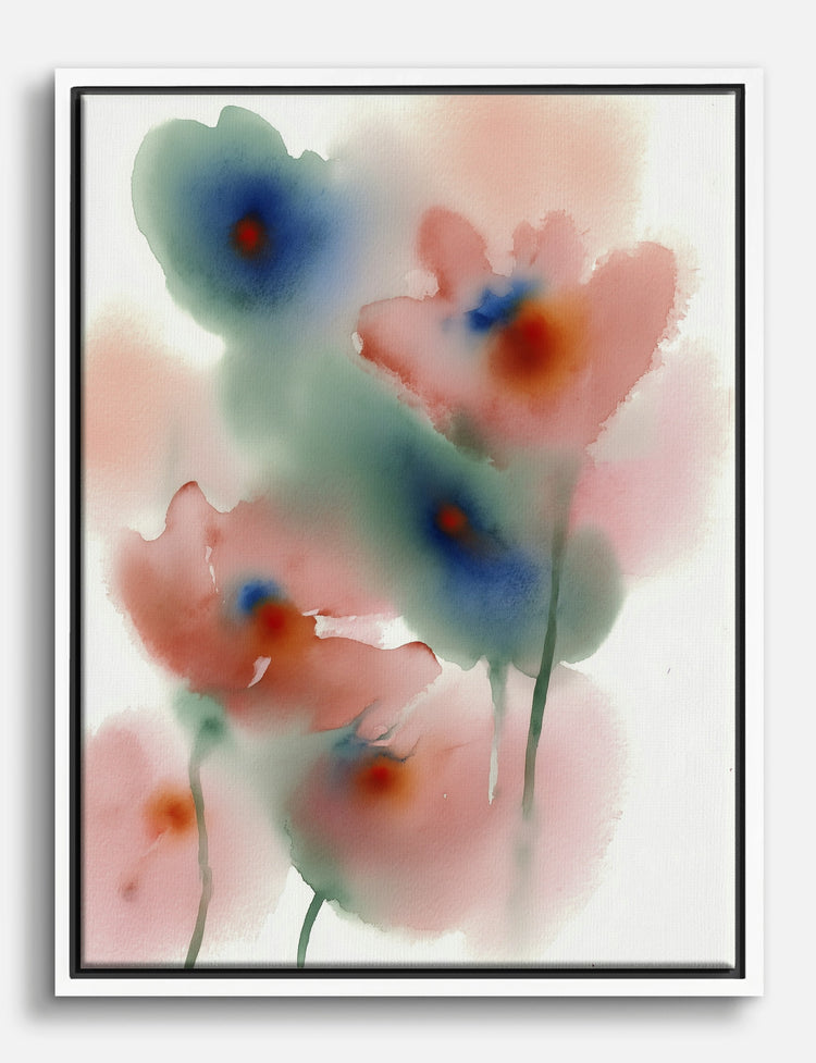 Soft washes of blush pink and misty blue bring a sense of calm and creativity to any room. This floral watercolor feels like a fresh spring morning—gentle, uplifting, and full of possibility.