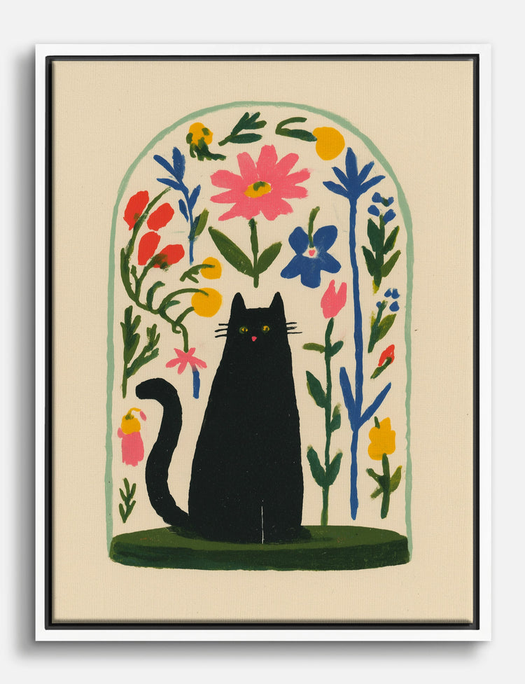 A curious black cat sits poised in a whimsical garden, surrounded by a joyful burst of wildflowers. This piece brings a playful sense of wonder and a touch of magic to your space, inviting you to pause and smile every time you pass by.