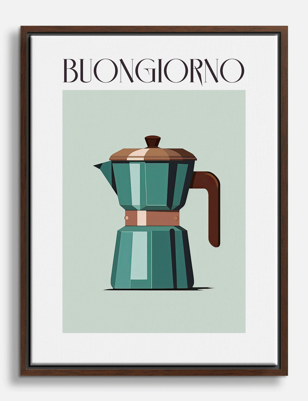 Start your day with a spark of Italian flair—this playful moka pot illustration brings instant warmth and character to your space. The soothing teal and rich brown tones pop against a crisp background, making it an effortless accent for kitchens or breakfast nooks.