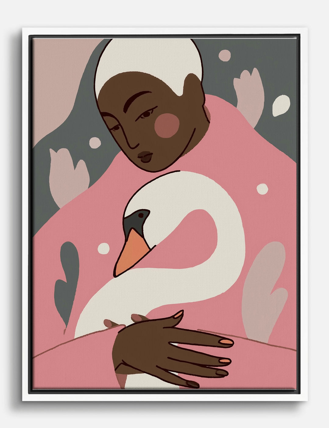 Soft pinks and gentle curves wrap your space in a sense of calm and belonging. This striking illustration invites you to slow down, breathe deep, and find comfort in quiet moments. The close embrace between woman and swan radiates warmth, making any room feel instantly more inviting.