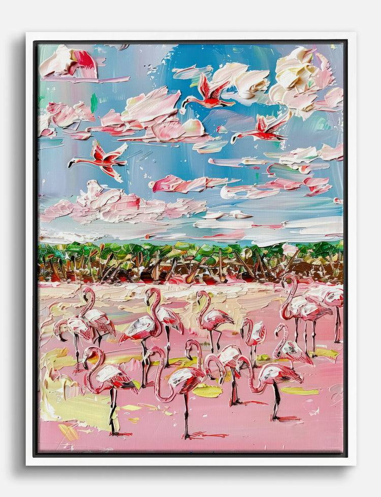 Step into a world of vibrant pinks and playful elegance with this stunning flamingo scene. Perfect for your living room or bedroom, it adds a splash of color and a touch of whimsy to any space. Let the dreamy skies and graceful birds inspire joy and self-expression in your home, all at an accessible price.