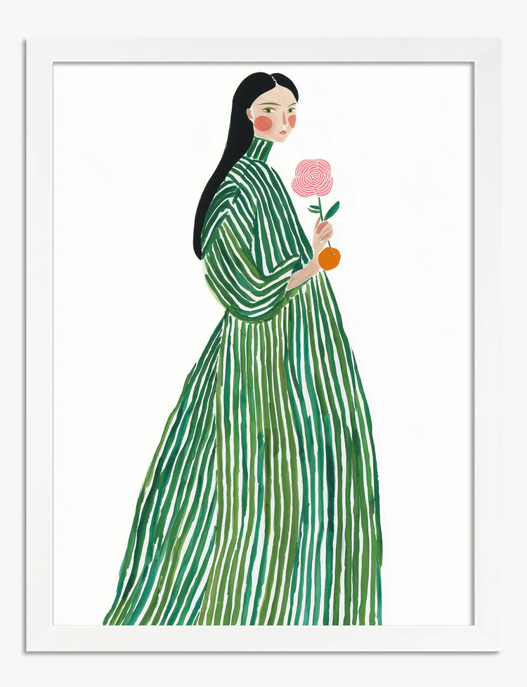 Bold stripes, soft elegance—this piece brings effortless style to your walls. A woman in a flowing green dress holds a pink bloom and a vibrant orange, inviting a sense of calm and quiet confidence into your space. This artwork instantly transforms a room, adding a whisper of fashion-forward flair without overwhelming your decor. The rich greens and playful pops of pink and orange pair beautifully with both modern minimalism and eclectic interiors. Hang it in your bedroom or living room to create a focal point that feels personal, fresh, and full of possibility. With every glance, you’ll be reminded that home style is all about embracing what makes you unique. Let your space reflect your creativity—no renovation required.