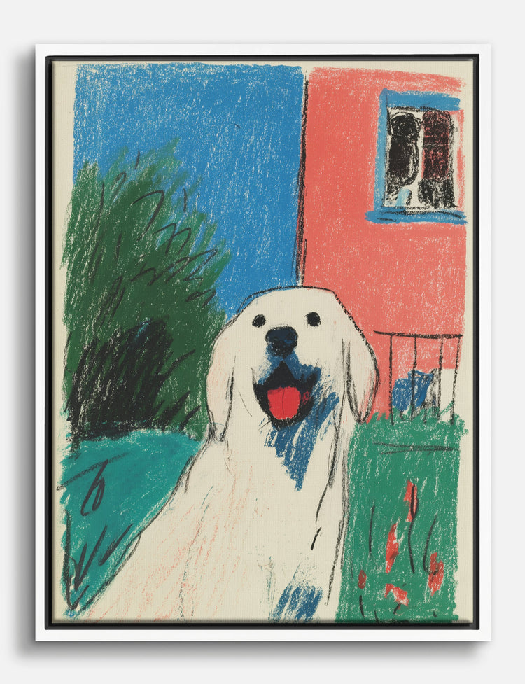 A bright burst of happiness, this playful golden retriever is ready to greet you with a wag and a smile. The vibrant blue sky and lush greenery pop against a cheerful coral house, instantly energizing any space.