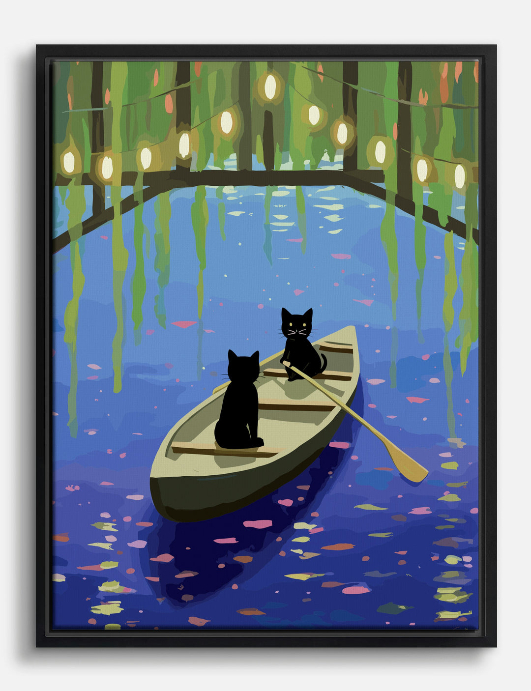 Dive into a world of enchantment with this whimsical scene of two cats enjoying a serene boat ride under twinkling lights. Perfect for your living room or bedroom, this artwork brings a touch of magic and tranquility to any space. The soothing blues and greens beautifully complement a variety of decor styles, inviting you to transform your home into a peaceful haven. Embrace the joy of unique art with this charming piece that’s as affordable as it is delightful.