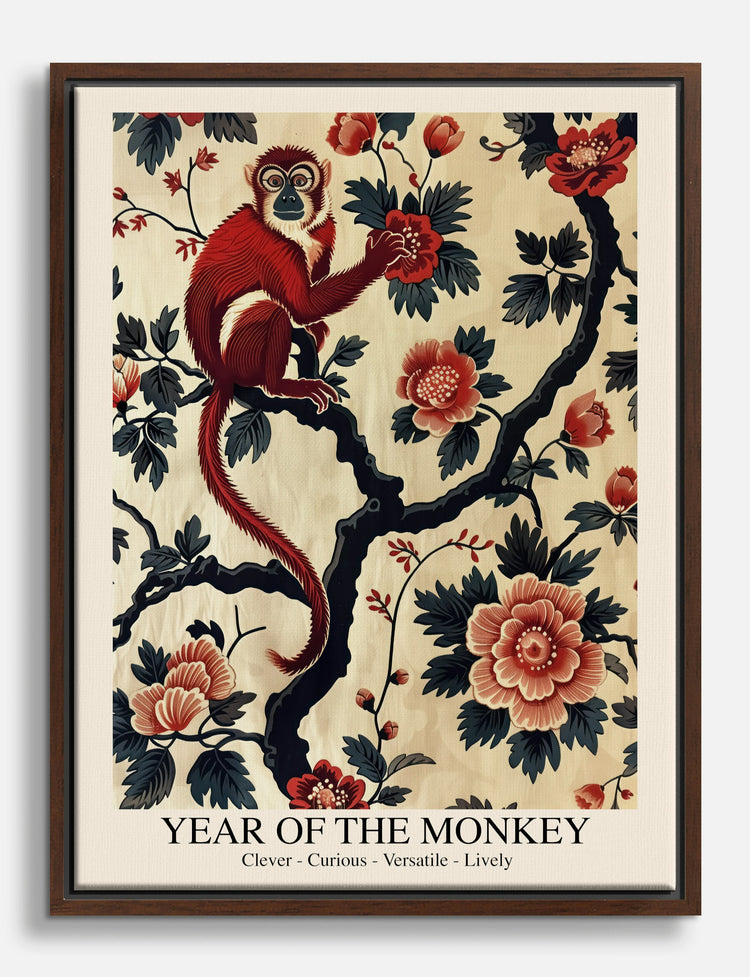 Bring a playful spark to your home with this enchanting scene—a curious red monkey perched among lush, blooming peonies, inspired by the timeless elegance of William Morris. The rich reds and deep botanicals pop against a creamy background, instantly adding a touch of personality and story to your space.