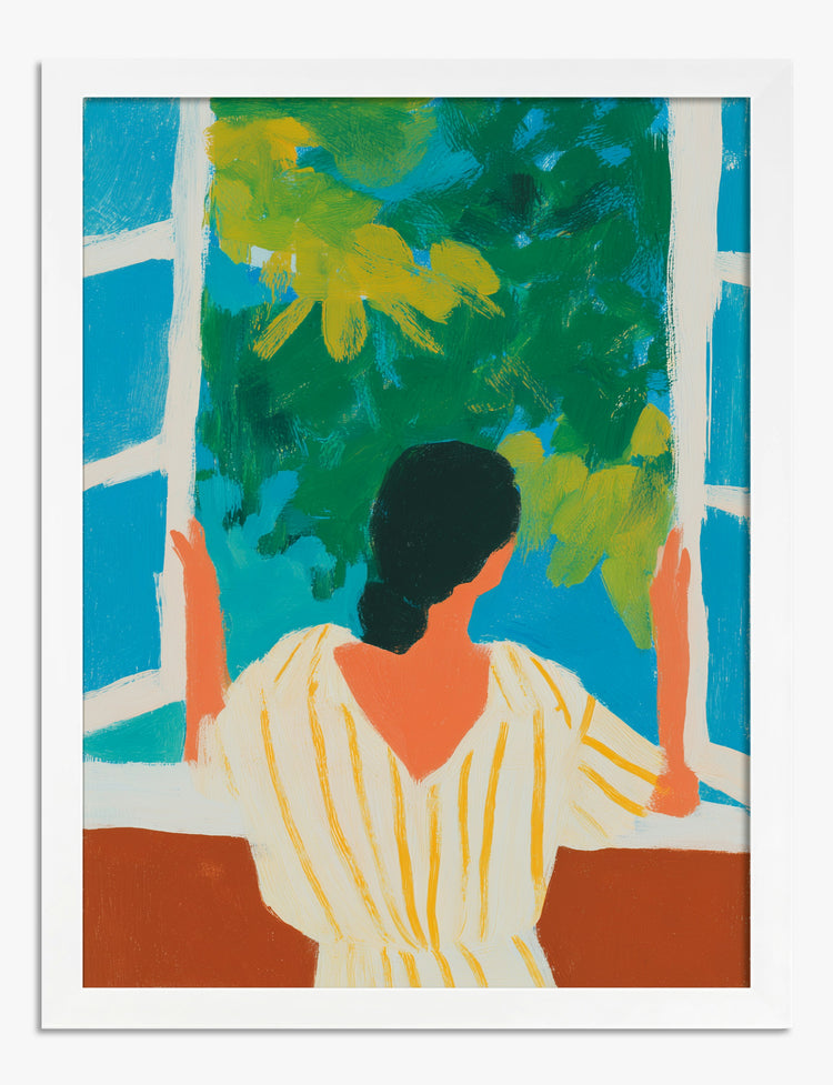 Step into a moment of quiet optimism every time you see this piece. A woman, bathed in sunlight, gazes out from her open window, inviting the lush greens and bold blues of the world right into your home. This print radiates calm and possibility, making it perfect for your bedroom or living room—places where you want to start and end your day feeling refreshed and inspired. The vibrant color palette pops against neutrals and harmonizes beautifully with modern or minimalist decor. Let this artwork be your daily reminder: style and serenity can be effortless. You don’t need a renovation—just a little art that feels like you.